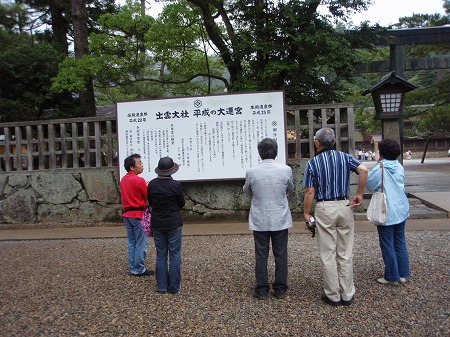 「平成の大遷宮」に関する告知板に見入る。 六十年ぶりの御本殿造営のため大国主命 は拝殿に遷宮され、現在はそこが仮本殿と なっている。 御本殿の姿が見られず残念ではあるが止むを 得ない。 |