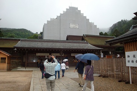 国宝の御本殿は、ご覧の通り造営のための 幕が張られて、その雄姿は想像するしか ありませんでした。 |