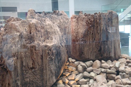 これは、博物館中央ロビーに展示された宇豆柱 (うづばしら)。 平成12年に出雲大社境内から出土した、 3本が一組となった柱の遺構だ。 この宇豆柱の出土によって、かつて巨大神殿が 存在したことが想像されるそうである。 |