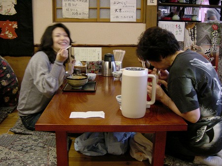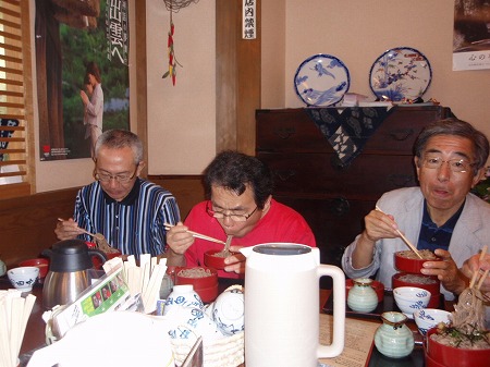「それでは軽く」などと言いながら、つい ふらふらと食堂へ。 まずは、乾杯! 写真奥の3人と鵜飼さんは、軽い食事。 手前の4人は、軽いお酒・・・のはずが、 なかなか地酒がよろしくて、次から次へ と注文を重ね、すっかりいい気分に なりました。 奥の4人は、いくら説得しても割前勘定を 認めてくれませんでした。 |