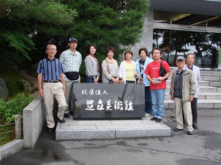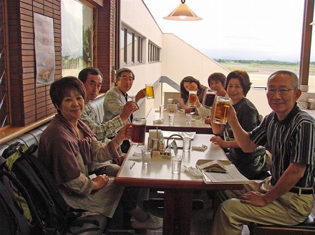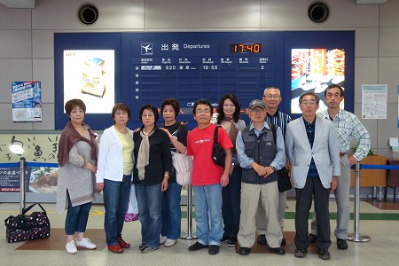 足立美術館を最後に、米子空港に向かい ました。 今井さんとは空港でお別れ。ご夫妻には、 備前焼の手ほどきに始まって、宿や食事の 手配など、大変お世話になりました。 お二人はレンタカーで備前へ。 我々は全日空820便(19時55分発)で 東京へ。 空港ロビーで全員そろって記念写真を一枚。 |