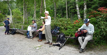 これから目指す最終地「渋温泉 御殿湯」 までは、山越えで後1時間弱は要するが、 川島さんは頑張って目的地まで行こうと言う。 そこで持参したパンを食べ疲労回復を願い 大休止をとることにした。 |