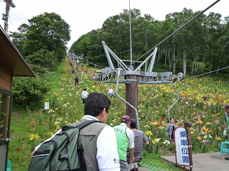 リフトの下には白、黄色、ピンク、橙、赤、黒色様々な 色のユリが咲き乱れそれも、ユリの花が足にぶつかる ほど、背丈が長く伸びている。 |