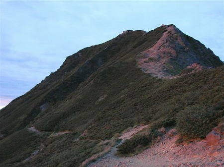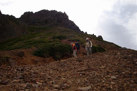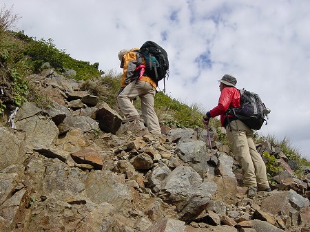 山小屋から少し行くと早速小石の多い岩場の急登に 取り付いて、小屋からの高低差280mを一気に登り 始めることになった。 |