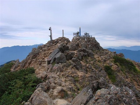 雲が流れて晴れてきた所為か、赤岳に増して360度 の眺望を堪能することができた。中央アルプスと御嶽山。 |