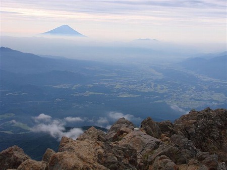 富士山の美しいシルエットも見応えがあった。 まだ日が当たらない茅野の街に目をやると、街明かり が遠くに点滅していた。 |