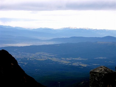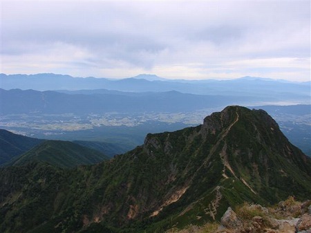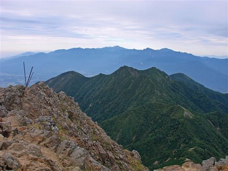 霧ヶ峰のはるか向こうに槍、穂高連峰 しばし赤岳山頂からの眺めを楽しんでから、今度は 中岳経由で阿弥陀岳を目指した。赤岳山頂から 中岳に向かう下山道は、展望荘からの登り道よりも はるかに急峻な岩場を下ることになる。 |