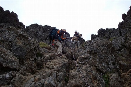 一歩一歩足場をしっかり確保しながら、鎖を頼りに 降りなければならない。次々に続く鎖場をとにかく 慎重に下りることにした。 |