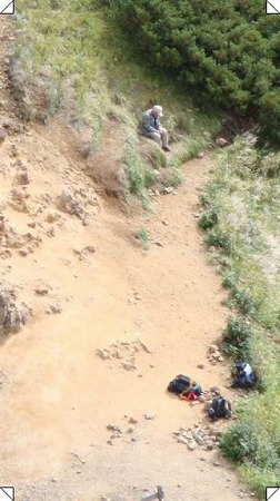 中岳と阿弥陀岳の鞍部で大休止。 気温が上がってきたので着込んだ服を脱いで薄着に。 赤岳からの岩場の長い下りで少々エネルギーを使い すぎた鵜飼さんは、阿弥陀岳往復は敬遠。 鞍部で堀さんと吉松のリュックを見張ってもらうことに なった。 |