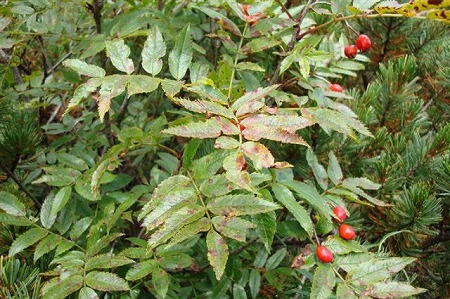遠くに阿弥陀岳を見ながら降りると、やがて辺りを 這い松がびっしり覆っている。 |