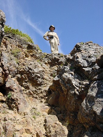 青空をバックに、満足げに岩場に立つ堀さん。 |