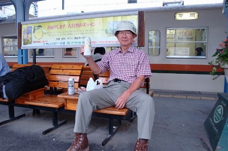 茅野駅ホームで、なにはともあれ缶ビールで乾杯! |