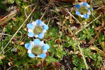 ネパールリンドウ(ゲンティアナ・デプレッサ)を見つけた。 秋のネパールを代表する花と言ってよい。 ナムチェ周辺から4000m辺りまでの日当りのよい斜面に多く見られる。水色と白のツートンカラーが鮮やか。 |