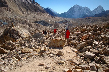 さて、高山病騒ぎも一段落し、12:15氷河に沿ってエヴェレストB.Cを目指す。 氷河は、大岩がゴロゴロした、まるで岩石砂漠だ。 |