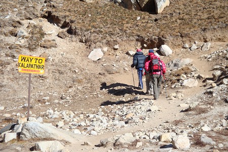 途中で休んでいるおばあさん。 なんと16回目のカラ・パタールで、おん歳77歳。喜寿だ。お供はこれまた還暦の女性。 西さんとおっしゃるそうだが、この西さん、息子は“西 穂高”娘は“あずさ” 勿論、梓川だ。 |