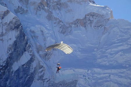 上を見るとヘリコプターが旋回している。なんとスカイダイビングだ。 カトマンドゥからヘリで来て、8000mのダイビングとはすごい。