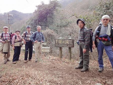 晴れていれば相模湾、駿河湾、富士等が 山頂から見えるのだが、今日は全く見えない。 風が強くトテモここで昼食は取れず、山頂 での記念写真を撮って即、下りに入る。 |