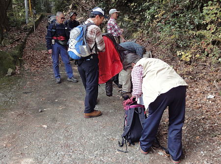 ここから急な舗装道路を登るが、これが結構 きつく、体が温まり準備運動を兼ねる。 約20分で舗装と別れ登山道に入る。 ここで一枚上着を脱ぎ本格的な山登りに備える。 |