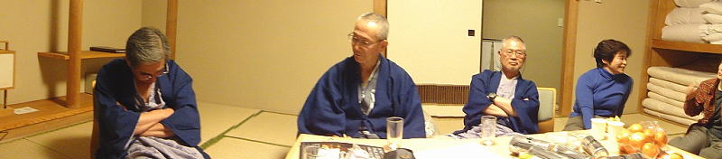 15:30にかんぽの宿別館に着き、チェックイン。 早速、冷え切った体を温泉に浸け温まる。 16時過ぎには直行組の小野寺さん、塩野 さんが駆けつけ、総勢9名で18時まで 食前酒のイッパイが始まり、来年の 山行計画案などで、話が盛り上がった。 18時に夕食。ここでも当然イッパイ。 19時から09年度クマさん会の反省会 (重大ハプニング)。 しかしもう、とってもいい気持ちの??さん・・・・ |