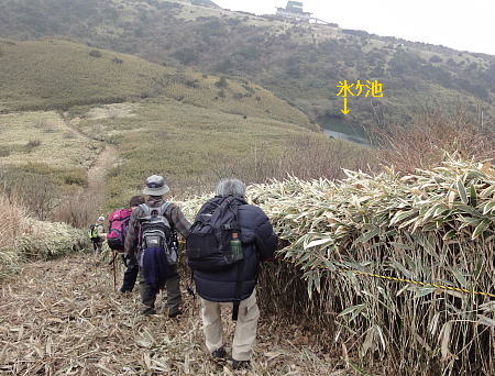 ここは風除けとなっており、遅い昼食となった。 風はないが気温が低く、「氷ケ池」は名の如く 薄氷が張っている。 今日は楽々コースと夜の忘年会があるため、 装備も簡単にし、雄さん、文さん、能勢さん、 熊本も湯沸しや、また恒例のアルコールも 皆持参していない。 堀さん、吉松さんが湯沸しとラーメンを持参し、 二人だけが暖かい思いをし、皆のヒンシュク を買う。 |