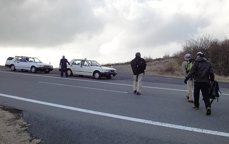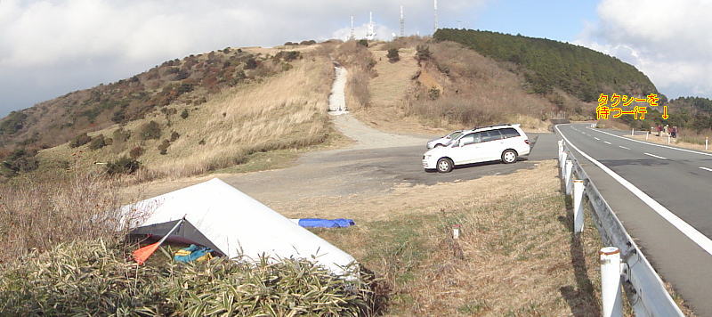 | 下山道を探してうろうろしていると、先のパトロールが再度現れ、又々注意だ。 我々は歩きに来たのに、歩くなとは(?)。 有終の美を飾ると思っていたが、最後は本年最大のハプニングであった。 仕方なく、歩くのをあきらめ、携帯でタクシーを呼ぶことにした。ちょうど道路の向かいは伊豆スカイラインの ハンググライダーの離陸地点である。それをめやすに来てほしいと頼んだが、1社目は場所がよく わからないと断られる。2社目はなんとか場所はわかってくれたが、7人乗れるジャンボタクシーはない とのことで、親切にもジャンボタクシーのある別のタクシー会社を紹介してくれた。 しかしそちらに電話したら、ジャンボは観光用途以外は応じていないとのことでまた断られた。 再び2社目に電話して2台で迎えに来てくれるように頼み、やっとOKとなった。全員、胸を撫で下ろす。 (この親切な2社目のタクシー会社は「熱海交通自動車」0557−82−8181です。 熱海でのご利用をお勧めします。) |