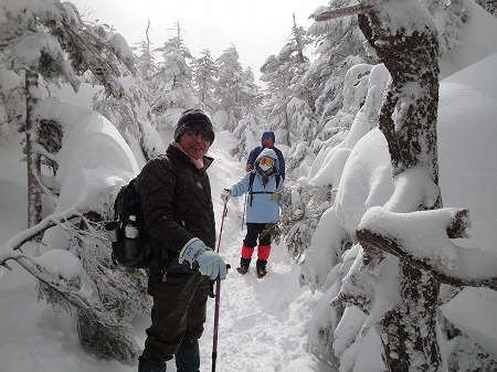 北横岳へ高度を上げていくと、バス道 も積雪があり粉雪がパラパラ落ちて いる。 |