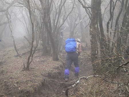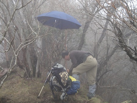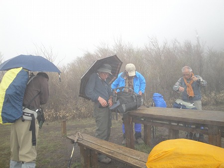 降りがひどくなり、あられ混じりとなる。 各自、雨具やザックカバーを着ける。 |