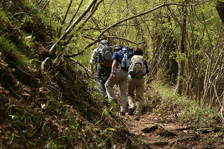 神主山から上はブナやミズナラの木が多く なり、根が張り巡らされた登山道に変わる。 幾つかのピークを超えると新緑の細い木に なってきた。 |
