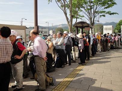 「都民の森」へ向かうバス停は長蛇の 列で、臨時便の増発となった。 幸いにも、川島さん、雄さん、熊本は 二台目の前列となり座れたが、他の 三名は一台目の後列で座れなかった ようだ。 8:22発の直通の急行バスに乗る。 |