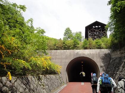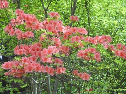 市内を抜け、秋川渓谷から南秋川に沿 って檜原都民の森へ山道に入ると、 薄紫のフジの花が満開に開いた木が 目に付き始める。 標高800mを過ぎると変わってヤマツ ツジの花が咲き始めた。 9:20終着「檜原都民の森」に到着。 |