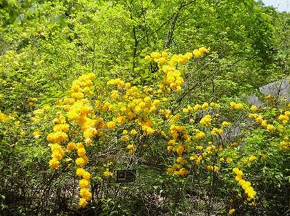 森林館の付近には八重や一重の ヤマブキの花が重そうに枝がシナって いた。 |