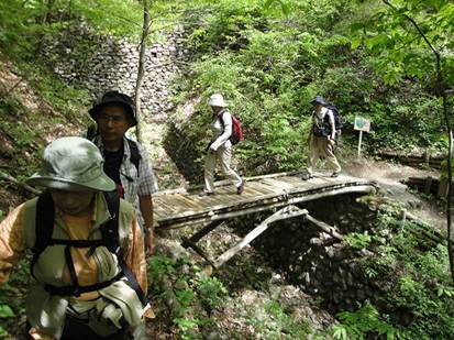 三頭大滝からの下りは木屑(ウッド チップ)を敷き詰めた登山道で クッションがあり非常に歩きやすい。