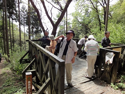 40分ほどで三頭大滝の展望台に 着いた。 展望場所は大きな吊橋の上であった。 |