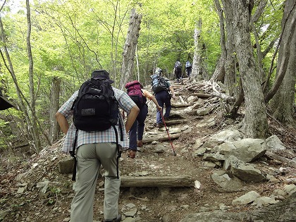 新緑の若葉が目に眩しい。 ブナ、ミズナラに樹林に標高1400m を超えるとダケカンバも出始めた。 |