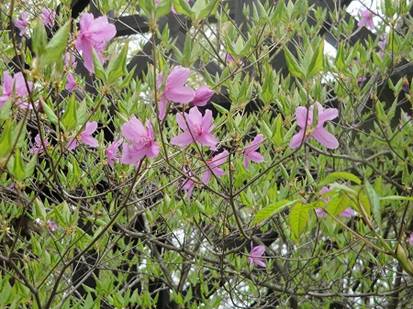 登山道に白い5弁の花びらが散って おり、何の花か分からず探すと、 遠くの木に白い花が咲いていた。 ムシカリである。 また。木の間に赤紫色の蕾が開き始め たツツジの木が見え出した。 |
