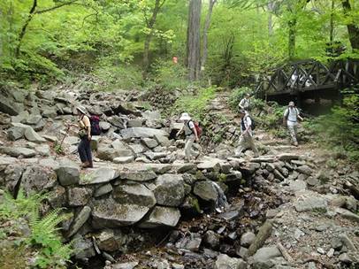 下山は三頭沢に沿って大きな石の堆積 した上を注意しながら下る。。 |