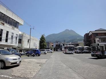 湯布院の駅の真正面には由布岳が見える。 予定ではあさっての13日に登ることにして いる。しかし本日は快晴ながら、天気予報 では梅雨入り真近で、13日が雨なら中止する かもしれない。いまのうちにということで カメラに収める。 |