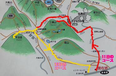 長者原登山口にある案内図。 写真に本日11日と明日12日のコースを加筆。 |