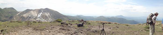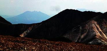 硫黄山道路も舗装が終わり、山道となる。 正面の硫黄山からは白い噴煙が上がっている。 猿渡さんによると、この噴煙が時々黒くなって 勢いを増すことがあるそうで、その時は一目散 に逃げるのだそうだ。 |