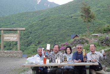 夕食は18:45。 時間はたっぷりあり、さっそく温泉に浸かり、 さっぱりして外のテーブルで乾杯!! すべての山登りはこの瞬間のためにあると思う。 予想を超えた晴天とミヤマキリシマの話題で 笑いが弾む。 |