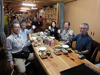 18:45夕食。食堂はその前の客、○○ワンゲルクラブ 様35名などがまだ酒盛りを続けており、割当て られたテーブルでは狭くてうるさいので、奥の テレビコーナーに移らせてもらい、また乾杯。 |