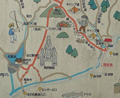 名郷から蕨山山頂までは3.5Kmで標高差720m約2時間30分。 山頂から河又への下りは7Kmで標高差810mの同じく2時間30分コースである。 9:10登山スタート |