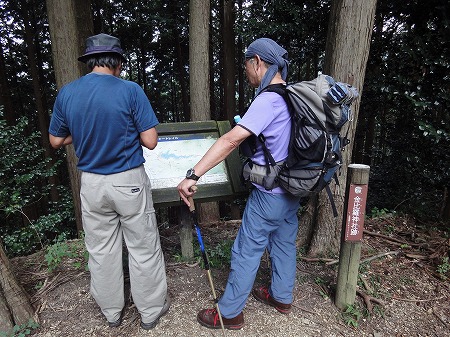 蕨山ハイキングコースの案内版の前でスタートの写真。 今日も良く晴れ渡り、風がなく暑い一日となりそうだ。