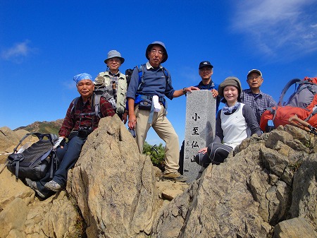 11:40に小至仏山に到着。 山頂は岩山になっている。 でパン等の軽食で小腹を騙す。 鳩待峠で根岸夫妻と待ち合わせであり、このままのペースでは13時下山予定と伝えてあり、心配するといけないので、堀さん、伊能さんの二名に先行して下山してもらうことにした。 |
