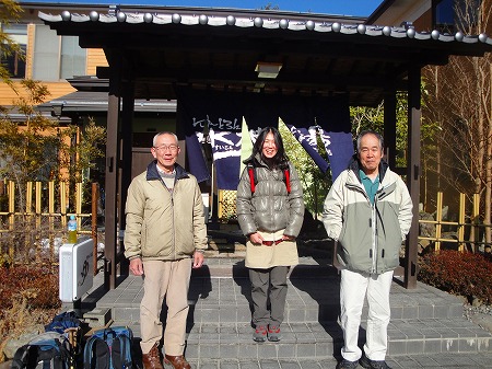 富士見駅9:15分到着。風もなく予想以上に暖かい。 タクシーが来るのを待つ吉松さん、佐藤さん。 |