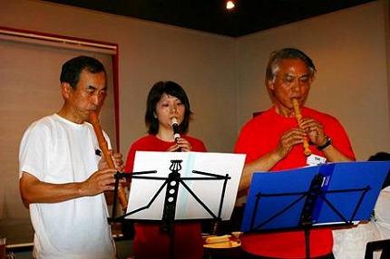 リコーダ演奏で宴の開始、森の音楽隊(左から高橋(文)さん、小野寺さん、竹内さん) |